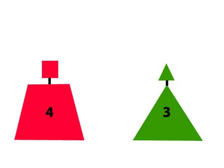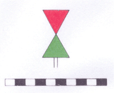 Het zijn driehoekige bakens op een paal. Aan de rechterzijde zijn ze rood met de punt naar beneden, aan de linkerzijde groen met de punt naar boven.